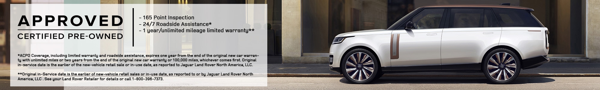 *ACPO Coverage, including limited warranty and roadside assistance, expires one year from the end of the original new car warranty with unlimited miles or two years from the end of the original new car warranty or 100,000 miles, whichever comes first. Original in-service date is the earlier of the new-vehicle retail sale or in-use date, as reported to Jaguar Land Rover North America, LLC. Vehicles can have either a one year/unlimited miles or two years/100,000 miles limited warranty coverage See your authorized Land Rover Retailer for complete terms and conditions.